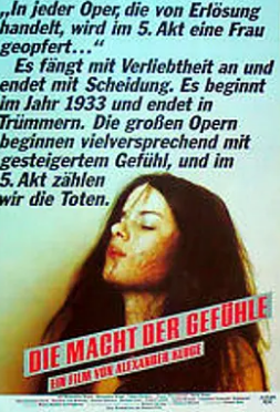 记录片,欧美大片情感的力量讲述了: The Power of Emotion explains that emotion isn't to be confused with sentimentality. Emotion is ancient and more powerful than any art form. The film looks at young couples who run into difficulties as they try to translate their experiences of love into clear decision-making. A woman who has shot her husband provides a judge with a puzzle. Those who love can bring the dead back to life by means of co-operation. That's the focus of the opera, "The Power Plant of Emotions" and the "Opera of the 20th Century" cinema. Alexander Kluge: The Power of Feeling When I started working on The Power of Feeling, I was not in a rational state. I did not say, I have a subject and now I will make a film about it. Instead I was spellbound and observed in my direct surroundings, for example, how feelings move. I have not really dealt with the theme of my mother's death and the fact that she was the one who taught me "how feelings move." Nor have I dealt with how she died. That was an entire palette of feelings: "All feelings believe in a happy end," and everyone believes tacitly that they will live forever: The entire palette is somehow optimistic, a positive attitude towards life having been put on the agendaas long as she was young, as long as her body held out, from one day to the next she collapsed. She just suddenly collapsed, like in an opera where disaster takes the stage in the fifth act. It felt as if I had observed an air raid or a disaster. The film The Power of Feeling is not about feelings, but rather their organization: how they can be organized by chance, through outside factors, murder, destiny; how they are organized, how they encounter the fortune they are seeking.What is all this organization of feelings about? Generally feelings tend to be a dictatorship. It is a dictatorship of the moment. The strong feeling I am having right now suppresses the others. For thoughts this would not be the case. One thought attracts others like a magnet. People therefore need affirmation by other people to be sure about their own feelings (to counteract the acquisition of their feelings through outside forces). Through the interaction of many people, for example, in public, the various feelings also have a magnetic attraction to one another just like thoughts do. Feelings communicate through their manifestation in public. The cinema is the public seat of feelings in the 20th century. The organization is set up thusly: Even sad feelings have a happy outcome in the cinema. It is about finding comfort: In the 19th century the opera house was the home to feelings. An overwhelming majority of operas had a tragic end. You observed a victim. I am convinced that there is a more adventuresome combination: Feelings in both the opera and traditional cinema are powerless in the face of destiny's might. In the 20th century feelings barricaded themselves behind this comfort, in the 19th century they entrenched themselves in the validity of the lethal seriousness.